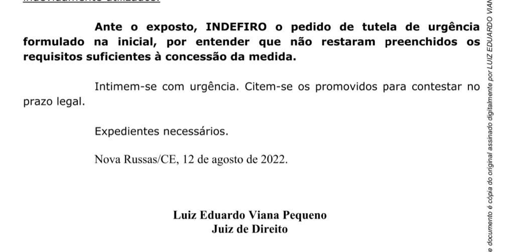 Na manhã desta sexta-feira (12) o juíz da comarca de Nova Russas não acatou o pedido do Ministério Público que pedia a suspensão do evento, e a festa irá acontecer normalmente nos dias previstos pela organização, veja o documento abaixo: