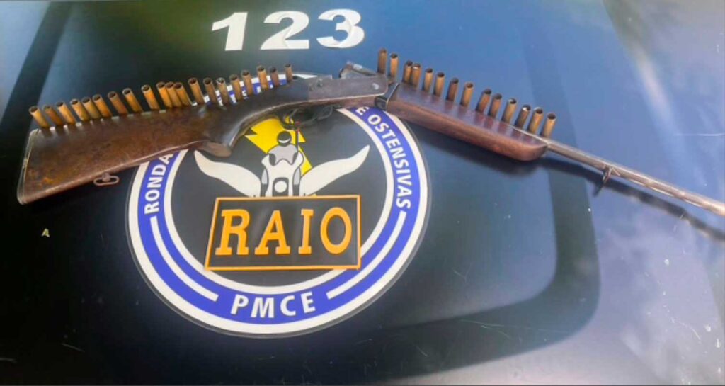 Na manhã desta segunda-feira (01/05) a equipe do BP Raio de Nova Russas esteve tomando conhecimento que um homem teria sido visto em uma motocicleta com uma espingarda na localidade de Gurgueia, zona rural do município, o homem identificado por Francisco Douglas Ferreira de 21 anos de idade foi localizado e de forma espontânea colaborou com a localização da arma e munições, por não possuir documentos comprobatórios para a legalidade da arma ele foi preso e encaminhado a Delegacia de Polícia Civil de Crateús.