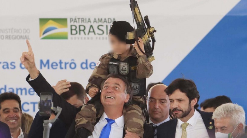 Em 2018, quando ainda era candidato à Presidência, Bolsonaro tentou ensinar uma criança a fazer um gesto de “arma” com a mão em um ato de campanha. A um garoto que estava em seus braços com a farda infantil da Polícia Militar, o presidenciável disse: “Você sabe atirar? Você sabe dar tiro? Atira. Policial tem que atirar”.