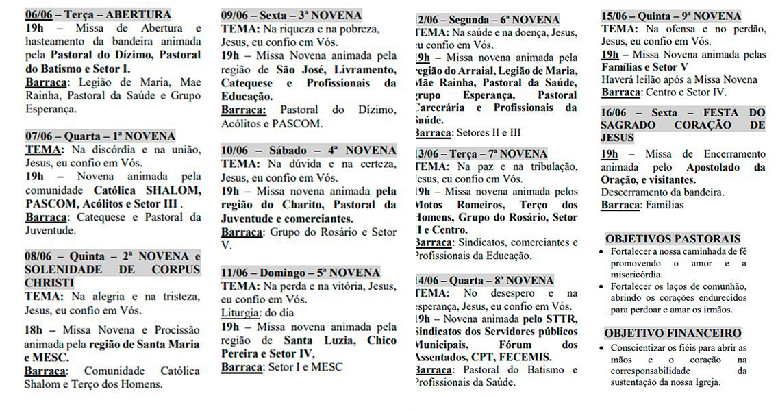 A Paróquia Nossa Senhora da Conceição de Ipueiras, inicia nesta terça-feira (06/06) a festa do Sagrado Coração de Jesus, que neste ano traz como tema ”No coração de Jesus, salvos pela graça e vocacionados à missão.”