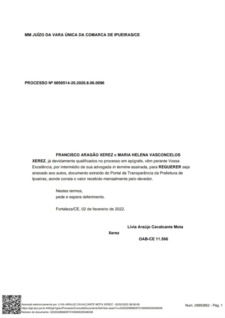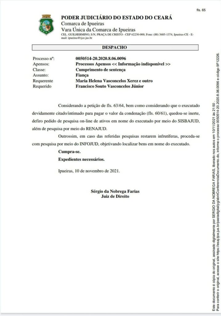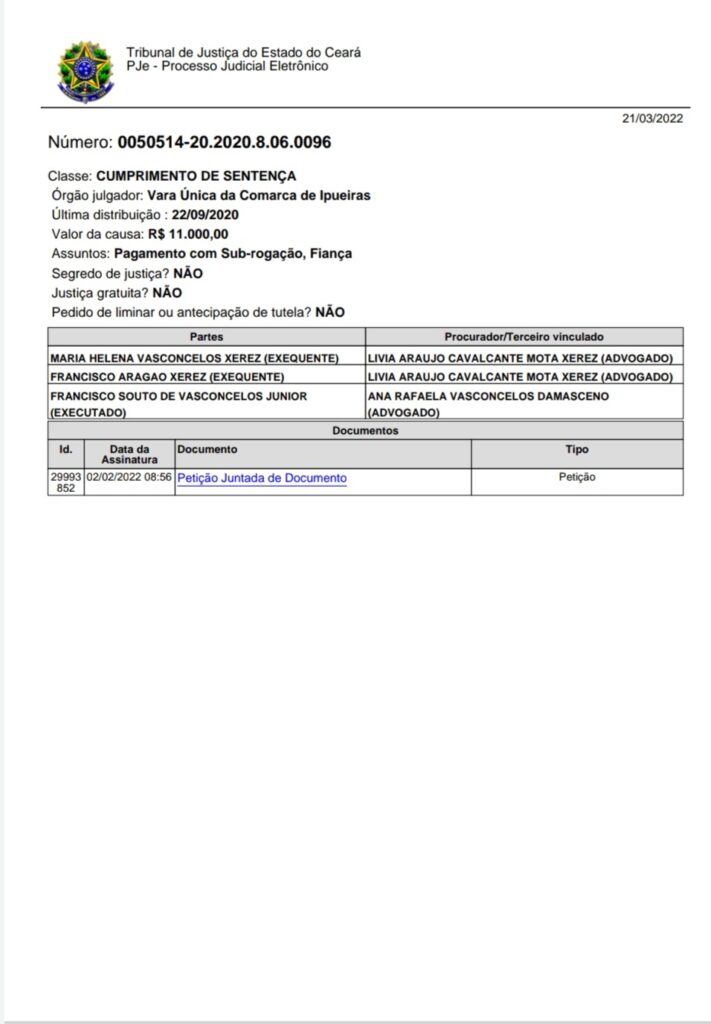 Recentemente a tia do prefeito entrou com pedido de Cumprimento de Sentença e solicitou busca nas contas bancárias do prefeito, a Advogada da Requerente juntou ao processo informações sobre o salário do prefeito constantes no Portal das Transparências do Tribunal de Contas do Estado do Ceará.