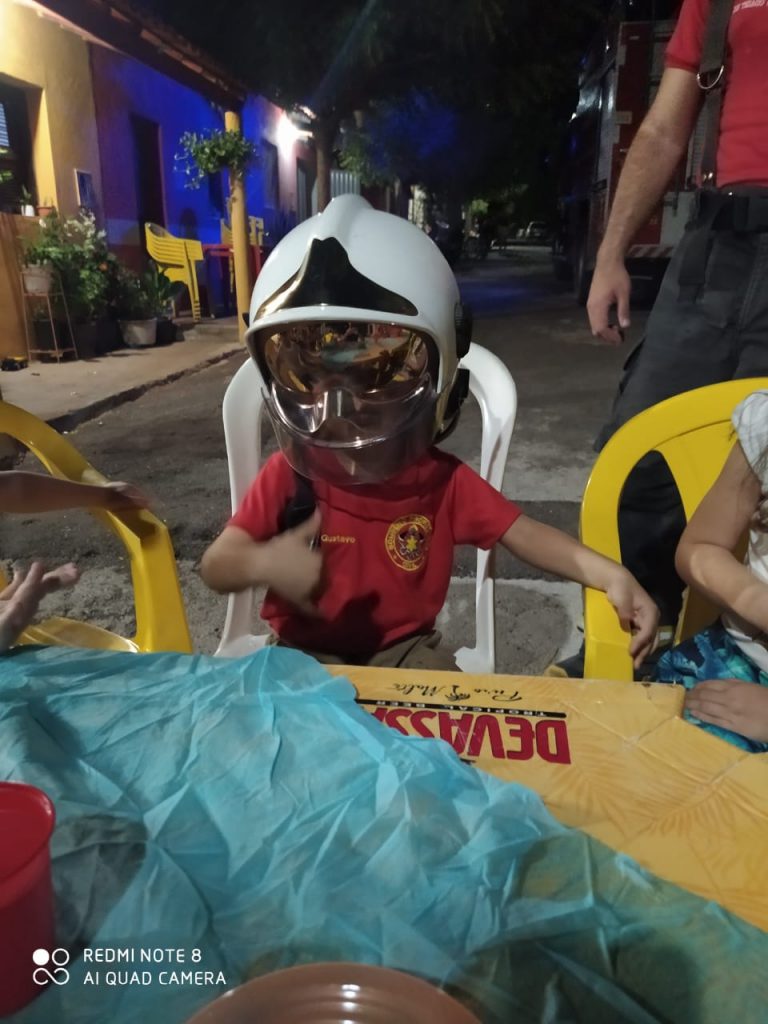 O garoto estava vestido a caráter, com farda e utilizou um capacete do Corpo de Bombeiros Militar.