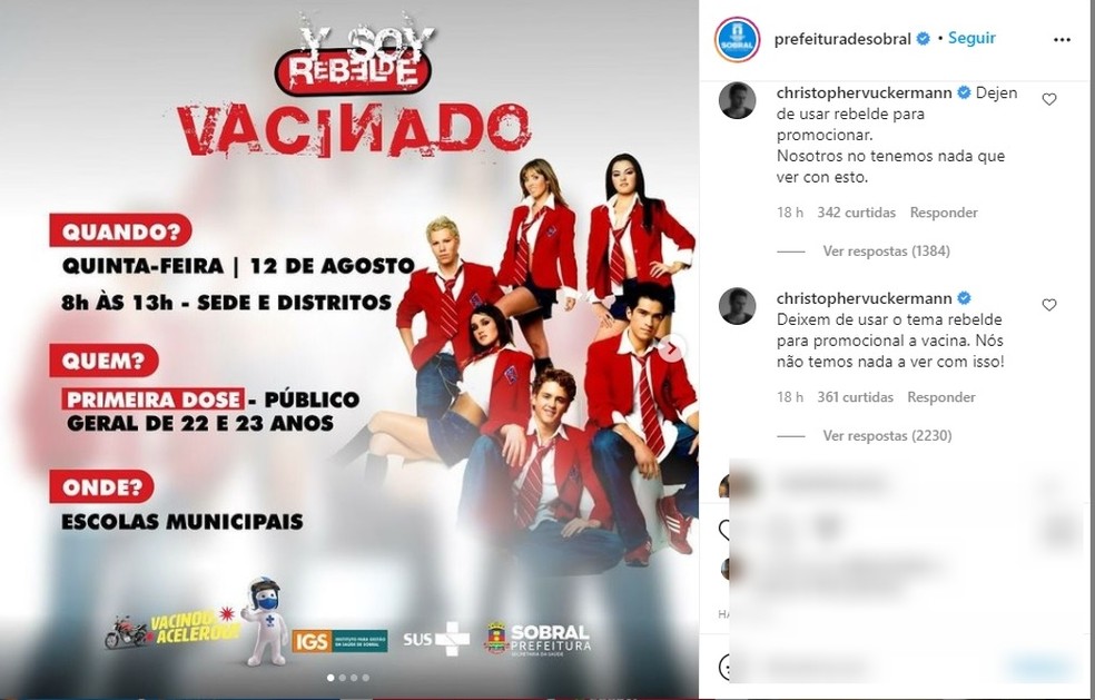 “Deixem de usar o tema Rebelde para promocional a vacina. Nós não temos nada a ver com isso”, comentou Christopher na publicação da Prefeitura de Sobral tanto em espanhol, como em português. Christopher, no entanto, não deixou claro na publicação o motivo para a reclamação do uso da imagem.