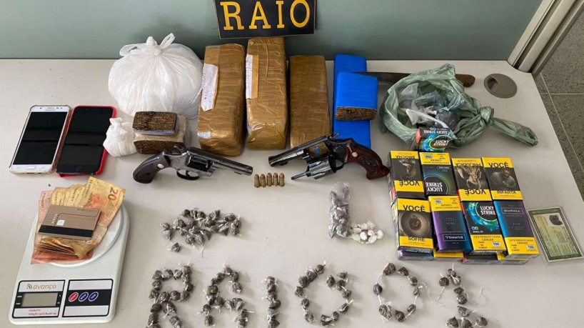 Após buscas nos acampamentos, os policiais encontraram 3,985 kg de maconha, 1,181 kg de cocaína, 17 carteiras de cigarros, uma arma de fogo, munições, facas, uma balança de precisão, celulares, além de documentos, dinheiro e duas motocicletas.