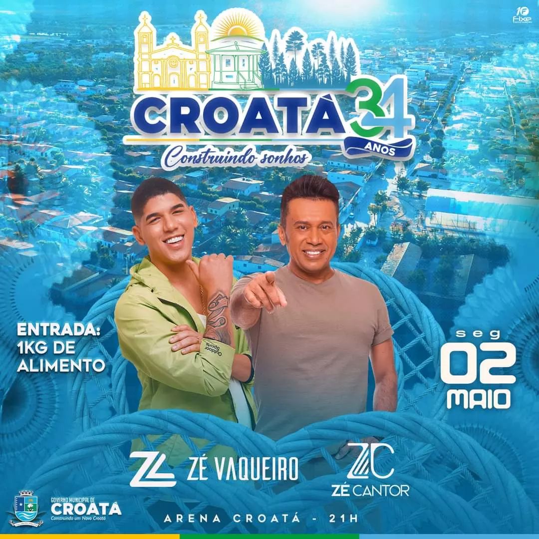 Em suas redes sociais, a Prefeitura do município de Croatá da Serra, anunciou duas grandes atrações para os 34 anos de emancipação política, um show beneficente a fim de arrecadar alimentos para às famílias carentes. Zé Vaqueiro e Zé Cantor farão a festa na recém inaugurada Arena Croatá, a entrada será 1kg de alimento. A festa irá acontecer no próximo dia 02 de maio.